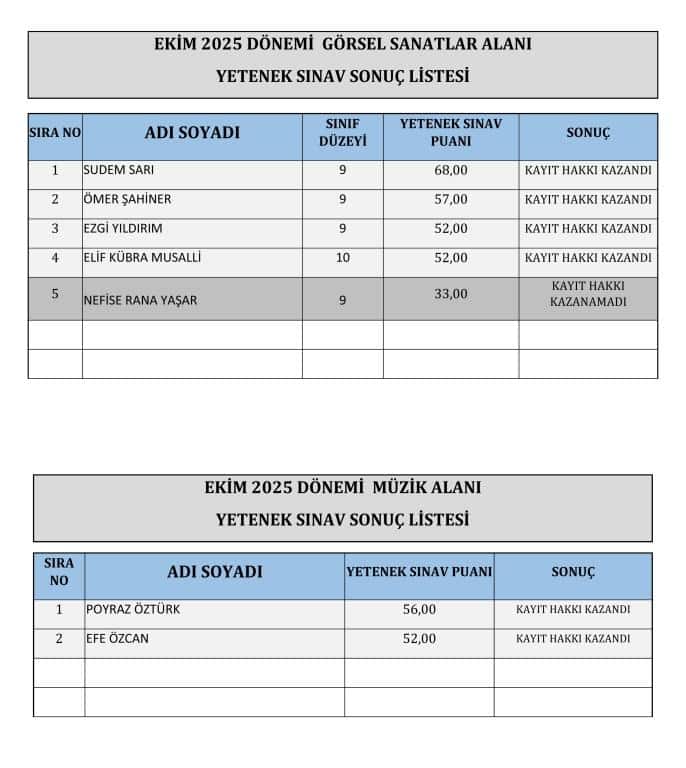 EKİM DÖNEMİ YETENEK SINAV SONUÇLARI